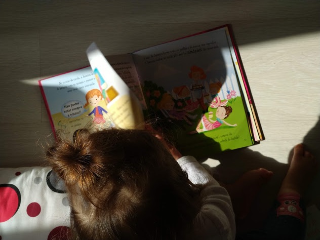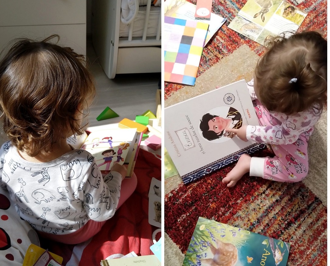 Citim împreună în fiecare zi, citim întotdeauna la culcare. Le răsfoiește singură „citind” cu voce tare imitându-mi interpretările, știe personaje, replici, idei. Știu că nu despre asta e vorba, dar trebuie să recunosc că suntem tare mândri de îndrăgosteala ei pentru povești.